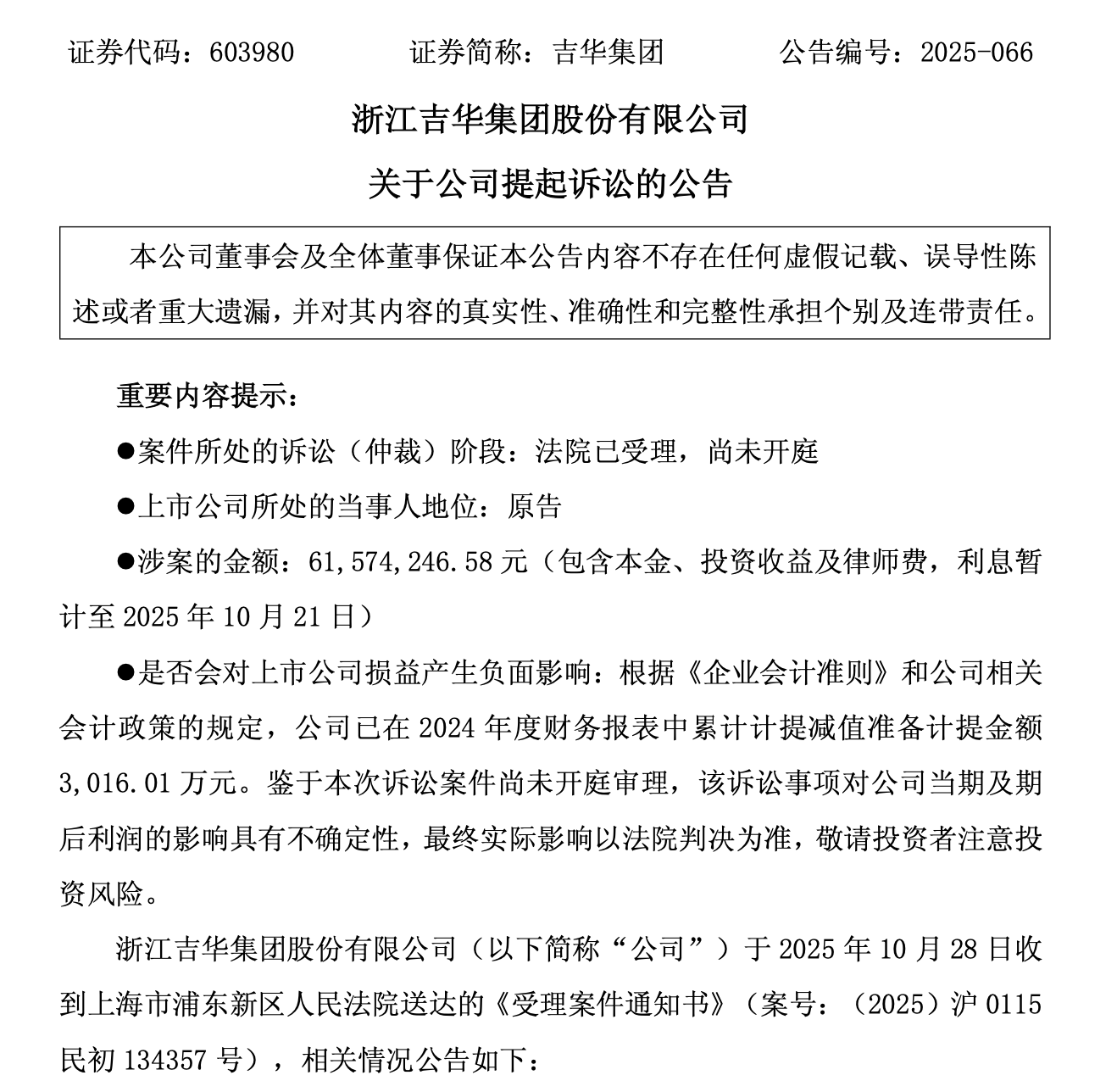 对于吉华集团而言,这笔投资已经对财务报表产生实质影响,公告显示,根据《企业会计准则》及公司会计政策,公司已在2024年度财务报表中累计计提减值准备3016万元。由于案件尚未开庭审理,该诉讼事项对公司当期及期后利润的影响具有不确定性,最终实际影响以法院判决结果为准。
