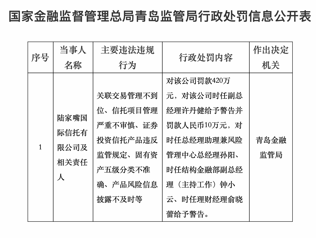 今年6月,陆家嘴信托因关联交易管理不到位、信托项目管理严重不审慎、证券投资信托产品违反监管规定、固有资产五级分类不准确、产品风险信息披露不及时等违规行为遭到国家金融监督管理总局青岛监管局420万的罚款。据媒体披露,在这些违规原因中,多项与华鼎18号相关。