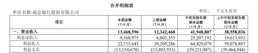 这一表现源于利息收入的爆发式提升与利息支出的相对稳定。第三季度,南京银行利息收入达227.2亿元,同比增长12.1%、环比增长8.6%;利息支出为131.6亿元,同比微降0.4%、环比微增1%,收入端的强劲增长有效对冲了支出端的变化,推动利息净收入大幅攀升。