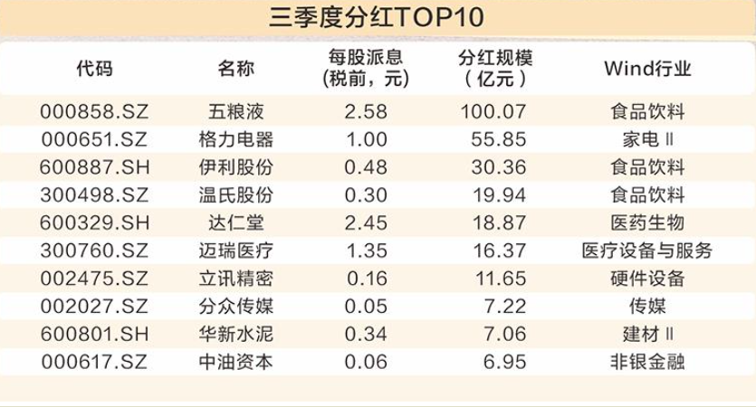 A股上市公司的高分红趋势在今年三季报中继续延续。据Wind统计,截至10月30日,A股共有219家上市公司提出三季度分红方案,计划分红金额达466亿元,拟分红企业数量、分红金额均保持在高位。上市公司落实一年多次分红,增强分红稳定性、持续性和可预期性,积极回报投资者的意识进一步增强。