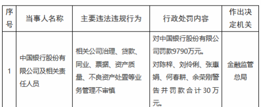 据披露,中国银行及相关责任人员在公司治理、贷款发放、同业业务、票据操作、资产质量管控、不良资产处置等多个核心业务管理环节,存在经营审慎性不足的问题。依据《中华人民共和国银行业监督管理法》等相关监管规定,监管总局除对中国银行股份有限公司处以9790万元罚款外,还对陈梓、刘伶俐、张聿娟、何春耕、余荣刚等相关责任人员给予警告,并合计处以30万元罚款。
