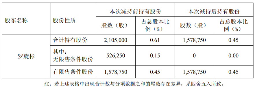11月6日,天禾股份(002999)发布公告,董事、高级管理人员罗旋彬通过集中竞价方式减持53万股,占公司总股本的0.15%。本次减持前后持股情况如下: