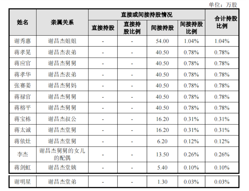具体来看,谢昌杰的姐姐谢秀惠持股比例为1.04%,为亲属中最高;两位表弟、三位舅舅及一位舅妈六人,分别持股0.78%。此外,叔公、堂舅等远房亲属也持有公司股份,持股比例在0.03%至0.31%不等。