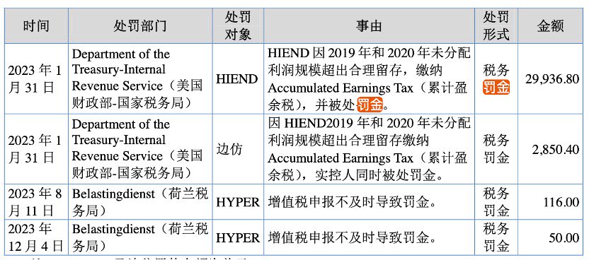 根据招股书,2023年,美国财政部、荷兰税务局均因为海菲曼的海外子公司税务问题作出处罚。分别因为2019年、2020年未分配利润超出合理留存追责公司及实控人边仿,作出税务罚金,2023年第一季度和第三季度增值税增值税申报不及时导致罚金。
