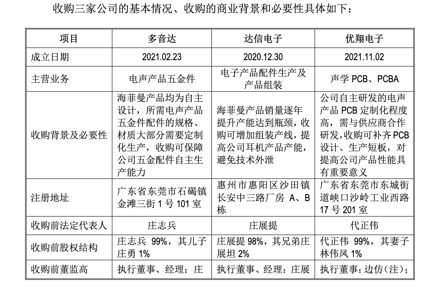 海菲曼通过“换股收购”收购了三家上游供应商,并且其中存在关联方交易。2021-2022年,海菲曼通过换股方式收购达信电子(电子产品配件生产及产品组装)和多音达(电声产品五金件)、优翔电子(声学PCB、PCBA)三家重要供应商的100%股权,掌控了耳机核心产业链。
