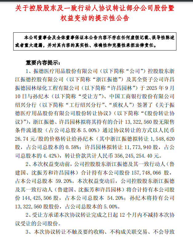 2025年9月10日晚,振德医疗公告显示,控股股东浙江振德及其子公司许昌园林以26.74元/股的价格,向孙纪木转让1332.26万股股份(占总股本5%),转让价款3.56亿元。本次转让价格较9月10日收盘价(29.45元/股)折价9.2%,股份于10月16日完成过户。