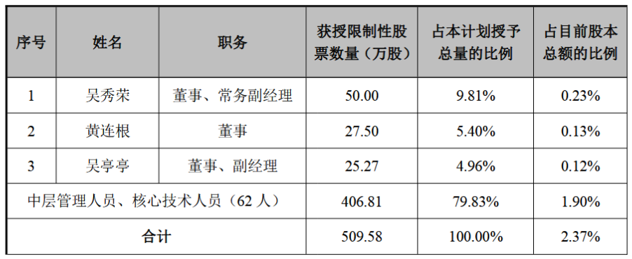 善水科技(301190)发布公告,公司于授予日2025年11月24日向65名激励对象授予510万股限制性股票,约占激励计划草案公告时公司股本总额的2.37%,授予价每股14.48元,具体情况如下: