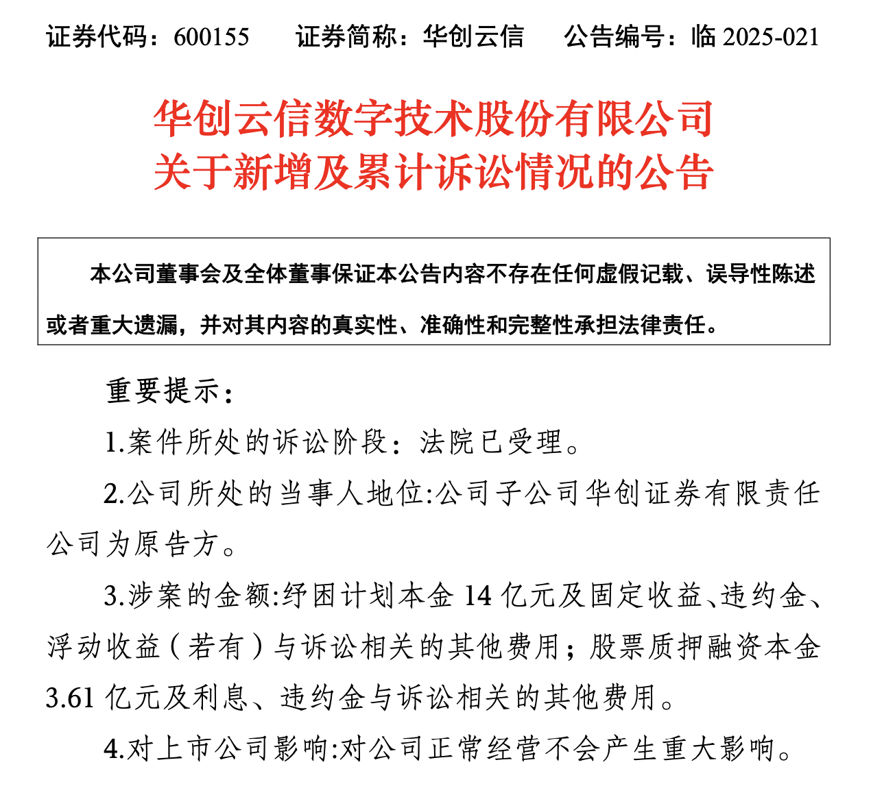 在纠纷的积累下,2025年矛盾终于爆发。8月14日晚,华创云信公告称,全资子公司华创证券已分别向贵阳市中级人民法院、云岩区人民法院提起诉讼,要求贵州百灵实控人姜伟及一致行动人姜勇、张锦芬等,履行纾困计划和股票质押借款相关义务,涉案金额约17.61亿元,包括纾困计划本金14亿元、股票质押融资本金3.61亿元。