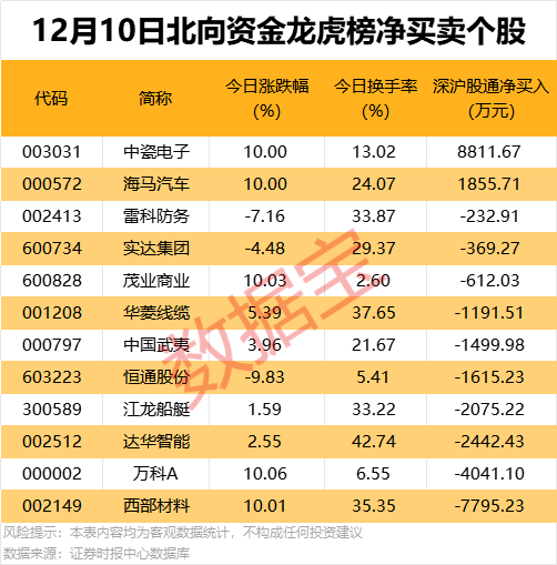 今日龙虎榜现身个股中,中瓷电子、海马汽车2股获北向资金净买入,金额分别为8811.67万元、1855.71万元。