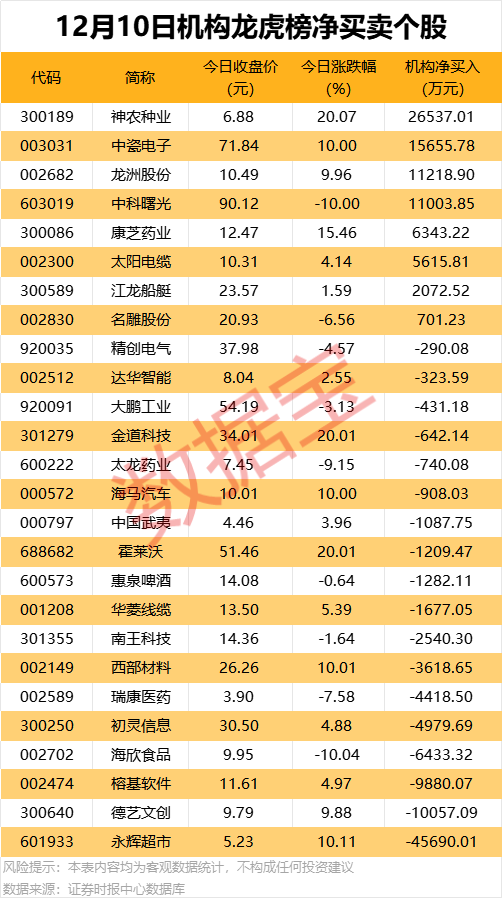 今日龙虎榜中,净买入个股有8只,净卖出的个股为18只。4股净买入金额均超1亿元,神农种业获机构净买入2.65亿元,居首;其次是中瓷电子、龙洲股份、中科曙光,机构净买入金额分别为1.57亿元、1.12亿元、1.1亿元。