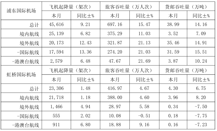 虹桥国际机场方面,飞机起降量为23,306架次,同比增长1.48%;旅客吞吐量为416.97万人次,同比增长4.67%;货邮吞吐量为4.3万吨,同比增长6.75%。