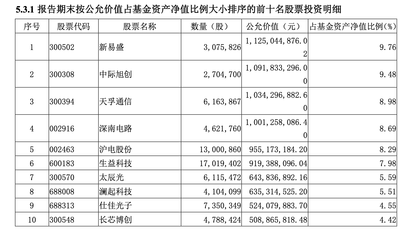 永赢科技智选混合A在2025年三季报中披露,其前十大重仓股合计占比为73.25%,属于典型的高集中度打法,前十大重仓股占基金净值的比例分别为:新易盛(300502)9.76%、中际旭创(300308)9.48%、天孚通信(300394)8.98%、深南电路(002916)8.69%、沪电股份(002463)8.29%、生益科技(600183)7.98%、太辰光(300570)5.59%、澜起科技(688008)5.51%、仕佳光子(688313)4.55%、长芯博创(300548)4.42%。