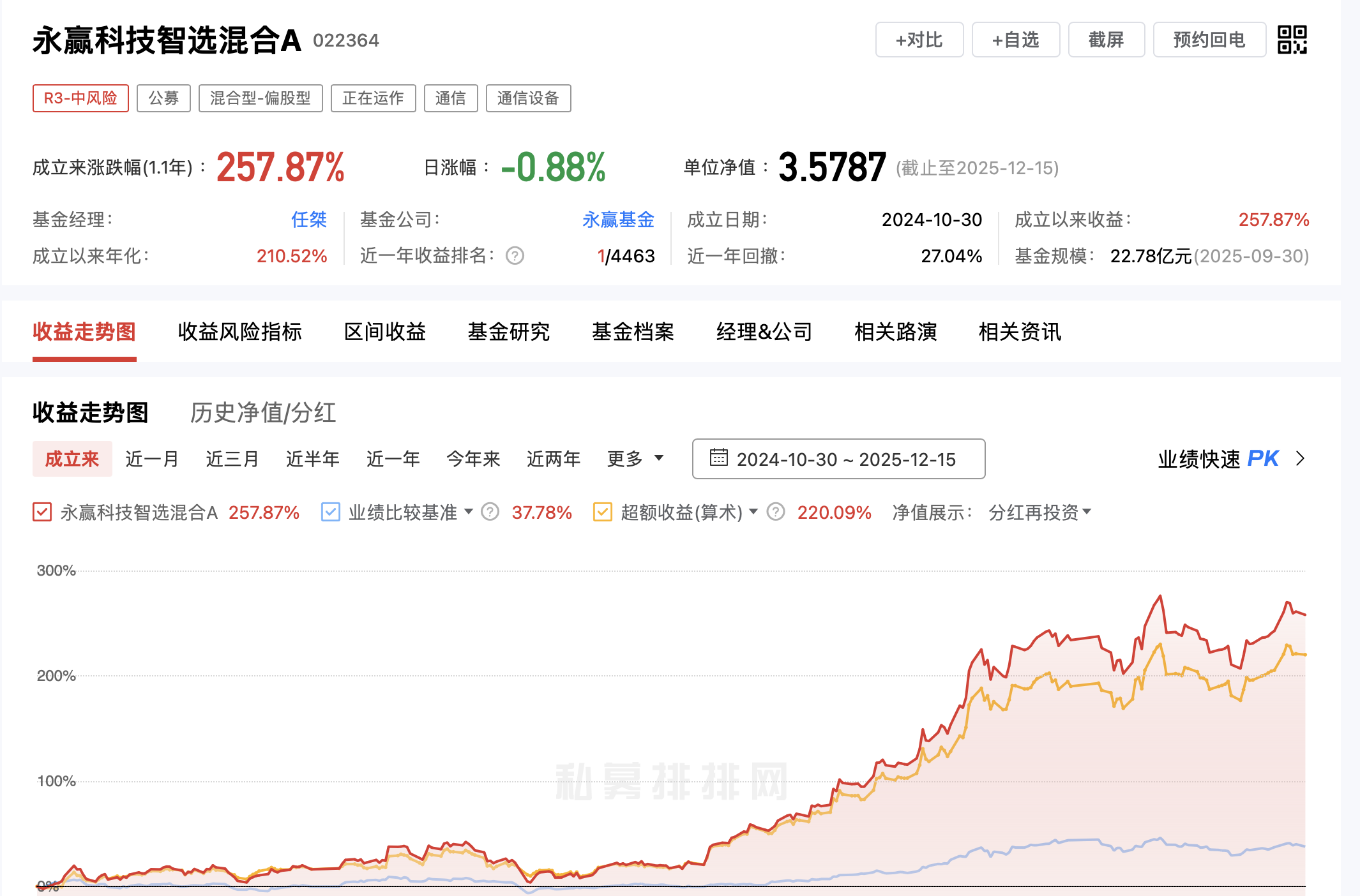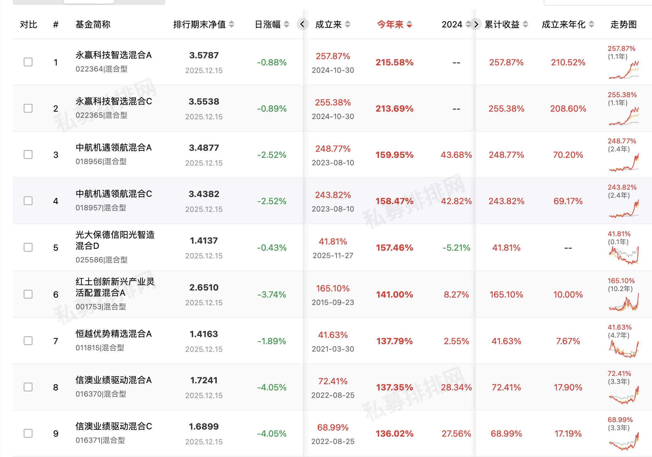 头部阵营中,永赢科技智选混合A以年内收益约215.58%的巨大优势几乎提前锁定了“冠军席位”。