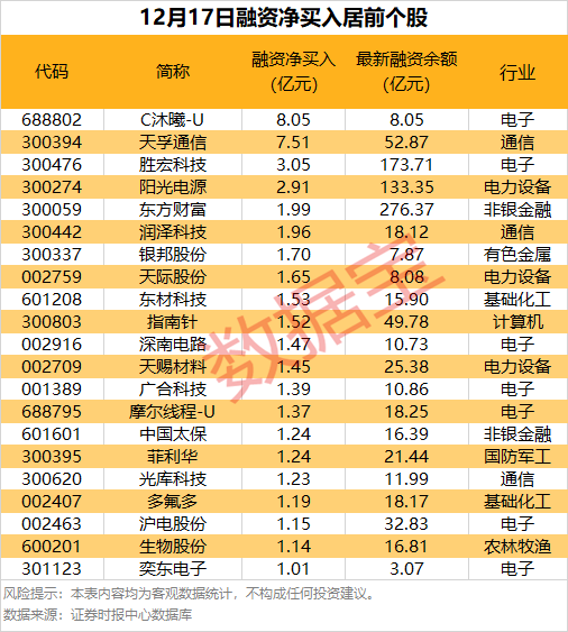 具体到个股,12月17日获融资净买入千万元以上的有345股,其中21股融资净买入额均超1亿元。