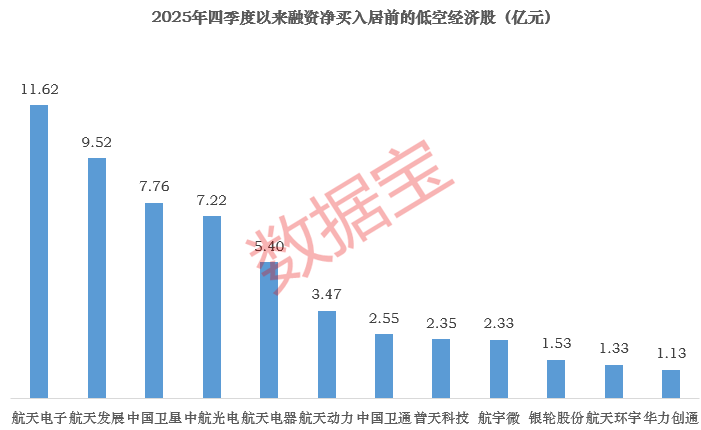 证券时报·数据宝梳理了2025年四季度以来(截至12月17日),融资客净买入居前的低空经济股,其中,金额在1亿元以上的个股共计12只。航天电子、航天发展、中国卫星、中航光电、航天电器排名前五,依次为11.62亿元、9.52亿元、7.76亿元、7.22亿元、5.4亿元。