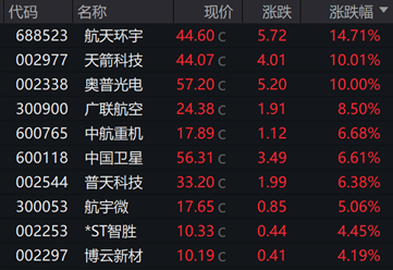 万得低空经济指数大涨1.68%。成份股中,天箭科技、奥普光电涨停,封单量分别有1.95万手、4.51万手;航天环宇大涨14.71%;广联航空上涨8.5%;中航重机、中国卫星、普天科技等多股跟涨,幅度均超过6%。