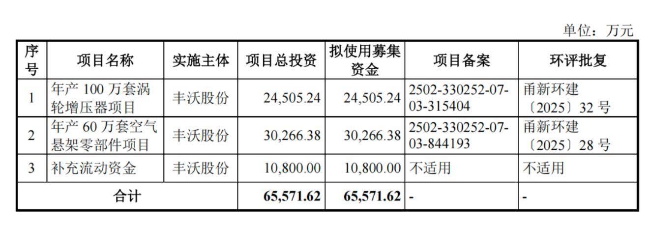 丰沃股份此次募资3.03亿元拟建设年产60万套空气悬架零部件项目,预计2026年才实现量产。目前仅有样件与少量定点,尚未转化为可确认的批量订单。竞争对手拓普集团(601689)、保隆科技(603197)、孔辉科技已大规模供货,丰沃股份作为后来者,市场切入难度被监管重点关注。