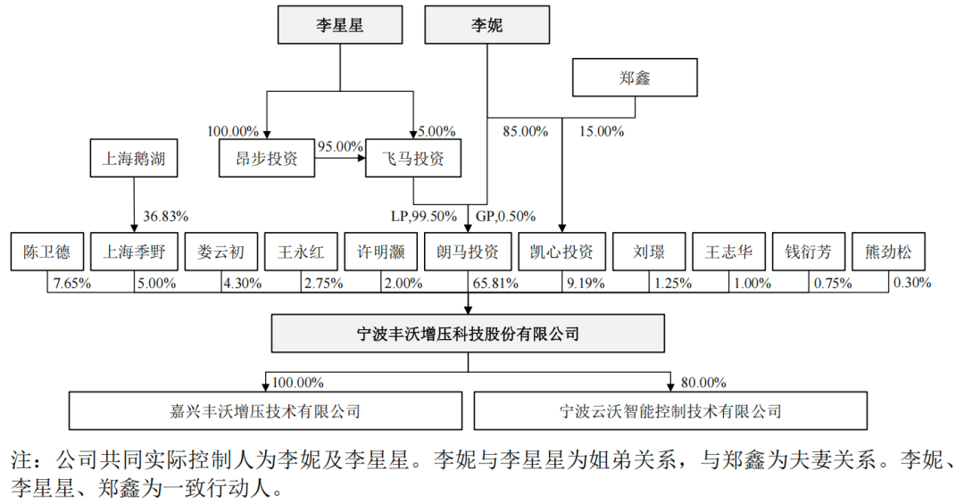 丰沃股份客户集中度与关联交易明细表(制表:财中社)公司实际控制人为李妮及李星星姐弟,两姐弟通过朗马投资(持有公司65.81%股份)和凯心投资(持有公司9.19%股份),合计控制公司75%的股份表决权。李妮、李星星及李妮配偶郑鑫为一致行动人。这种家族控股框架下,关联交易的公允性与业务独立性被反复追问。