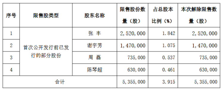 12月22日,珠城科技(301280)发布公告,公司4名股东合计所持536万股首次公开发行前已发行的部分股份将于2025年12月26日上市流通,占公司总股本的3.915%,具体情况如下: