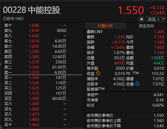 2025年12月24日,中能控股收盘价为1.550港元/股,单日涨幅高达7.64%。