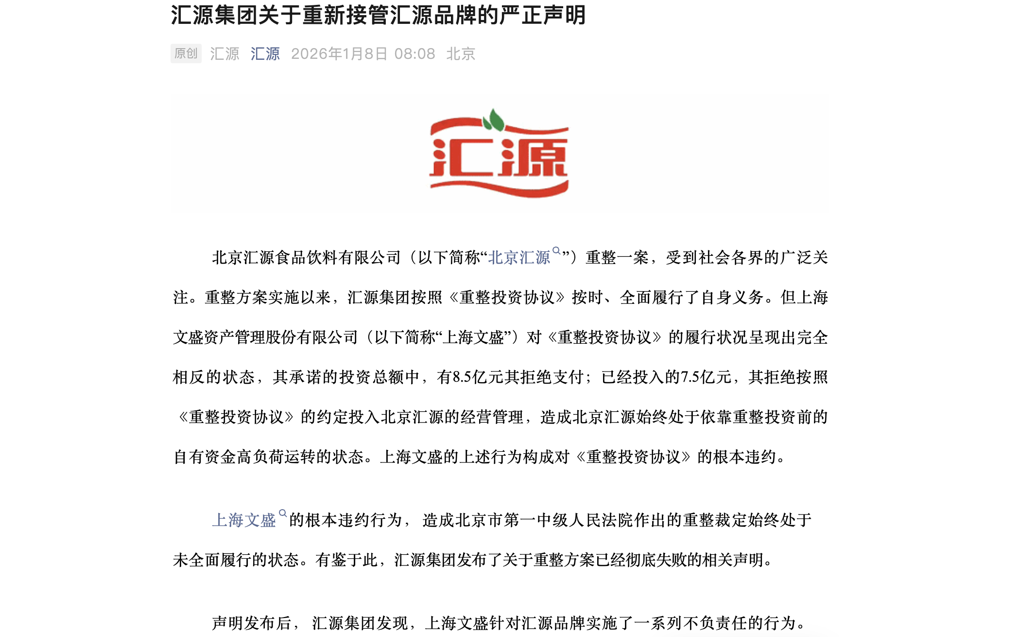汇源集团决定终止重整投资协议,重新接管汇源果汁经营。1月8日,汇源集团宣布,公司为期3年多的破产重整方案失败,因重整投资人文盛资产管理股份有限公司(下称“文盛资产”)违约,汇源集团将重新接管汇源品牌。