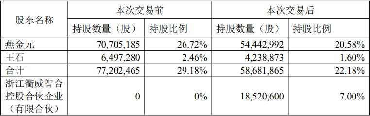 1月12日,宝莱特(300246)发布公告,控股股东、实际控制人燕金元及其一致行动人、实际控制人王石拟通过协议转让方式,将其持有的公司无限售流通股1852万股,占公司总股本的7.00%,以每股9.45元的价格转让给浙江衢威智合控股合伙企业(有限合伙)。本次转让价款总计1.75亿元。