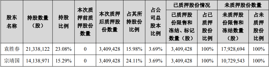 1月13日,诺瓦星云(301589)发布公告,控股股东、实控人袁胜春和宗靖国各自将所持有的341万股股份办理质押,占其持股比例分别为15.98%和24.11%,合计占公司总股本的7.38%。