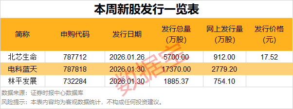 根据发行安排,本周暂有3只新股申购,本周一(1月26日)可申购北芯生命,本周五可申购林平发展、电科蓝天。