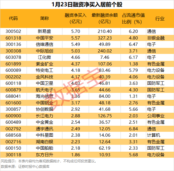 具体到个股,1月23日共有1460只股获融资净买入,净买入金额在1亿元以上的有49只,其中4只融资净买入额超5亿元。新易盛融资净买入额居首,当日净买入5.70亿元,其次是中国平安、信维通信、中际旭创,融资净买入金额分别为5.57亿元、5.49亿元、5.03亿元。