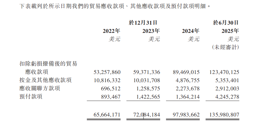 招股书显示,公司贸易应收账款规模持续攀升,从2022年末的5326万美元,增至2025年6月末的1.23亿美元,在流动资产中的占比达66.5%。对于分销企业而言,2025年上半年营收仅1.43亿美元,期末应收账款却达1.23亿美元,占营收比重高达85.8%。