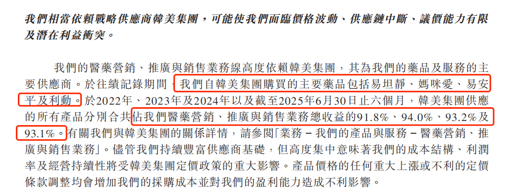 招股书显示,2022年至2025年上半年,韩美集团供应的产品占其医药营销业务收入的九成左右。这意味着,科郦的命运并不掌握在自己手中,而是在数千公里外的首尔总部。