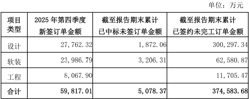 1月26日,郑中设计(002811)发布公告,2025年第四季度公司装修装饰业务新签订单金额合计为5.98亿元,累计已中标未签订单金额为5078万元,已签约未完工订单金额为37.46亿元。具体情况如下: