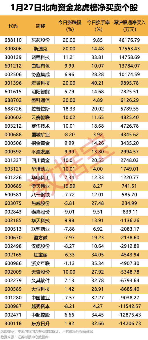 今日龙虎榜现身个股中,20股获北向资金净买入,净买入居首的是东芯股份,金额为4.62亿元;斯迪克、晓程科技、白银有色(维权)等均获净买入超1亿元。