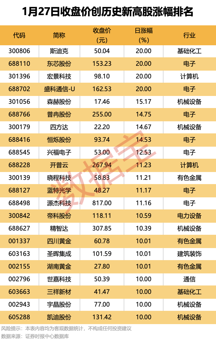 收盘价创历史新高股中,今日股价平均上涨6.53%,涨停的有斯迪克、东芯股份、宏景科技等,涨幅居前的有森赫股份、普冉股份、四方达等。