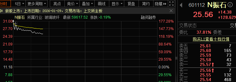 N振石今日上市,开盘价30.00元,上涨168.34%。
