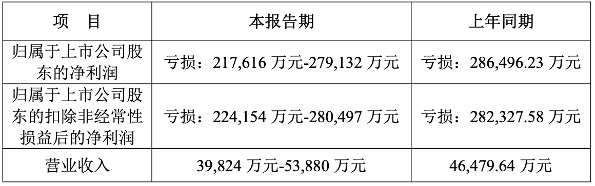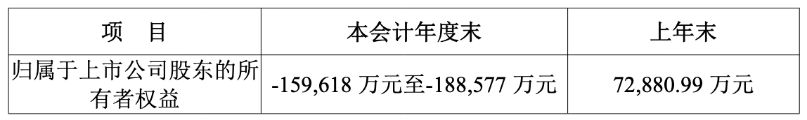 公告中还提到,归母净资产预计为负值,范围在-15.96亿元至-18.86亿元,上年末为7.29亿元。