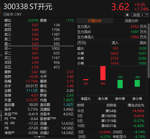 《财中社》发现,通过成交价和成交数量来计算,每股成交价仅3.01元。截至2026年2月2日收盘,ST开元涨幅达7.74%,收盘价为3.62元/股。