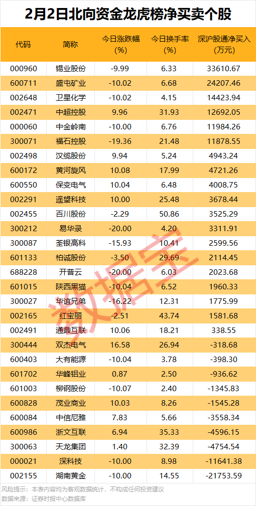 今日龙虎榜现身个股中,19股获北向资金净买入。净买入居首的是锡业股份,金额为3.36亿元;盛屯矿业、卫星化学、中超控股、中金岭南、福石控股均获净买入超1亿元。