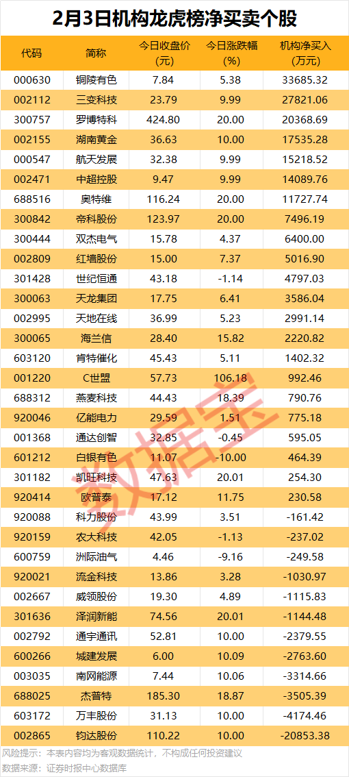 今日龙虎榜中,机构净买入个股有22只,净卖出的个股为12只。7股获机构净买入金额超1亿元,铜陵有色净买入3.37亿元,居首;其次是三变科技、罗博特科,机构净买入金额分别为2.78亿元、2.04亿元。