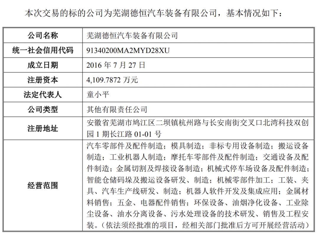 芜湖德恒成立于2016年7月27日,注册资本为4109.7872万元,法定代表人童小平,主营汽车零部件及配件制造、模具制造、非标专用设备制造、工业机器人制造等,注册地址位于安徽省芜湖市鸠江区二坝镇北湾科技双创园。