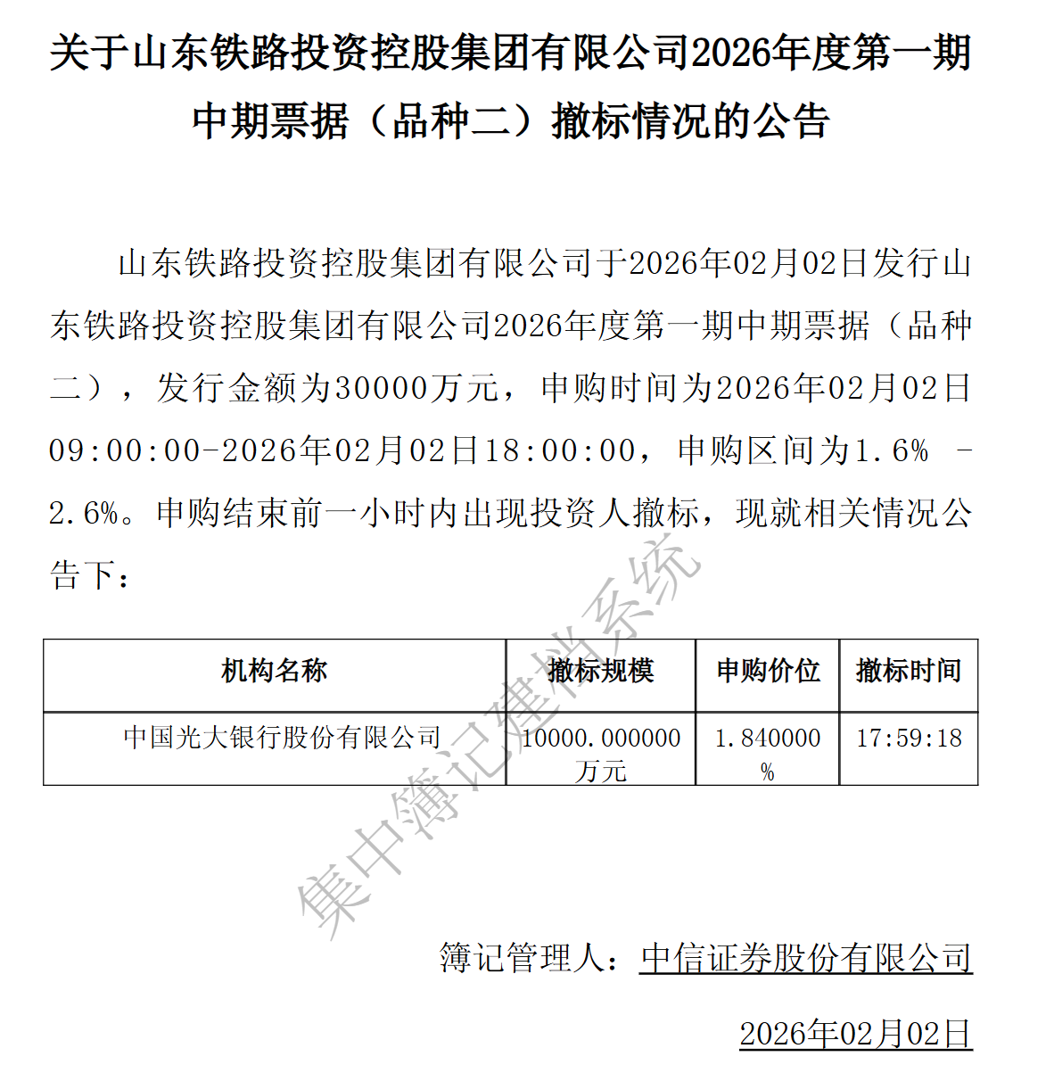 2026年立春后,山东铁路投资控股集团有限公司(下称“山东铁投”)发行中期票据期间,出现一笔“最后一分钟”的申购撤回。