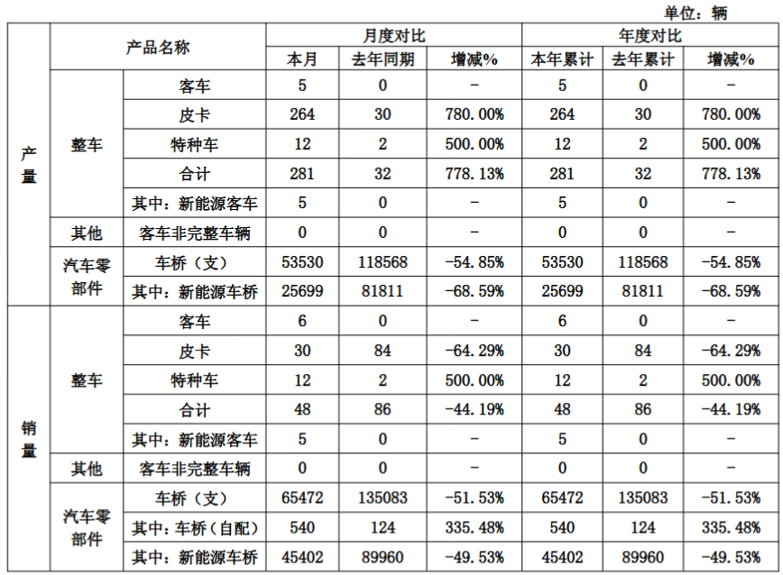 汽车零部件方面,公司1月车桥产量5.35万支,同比下降54.85%;车桥销量6.55万支,同比下降51.53%,具体数据如下: