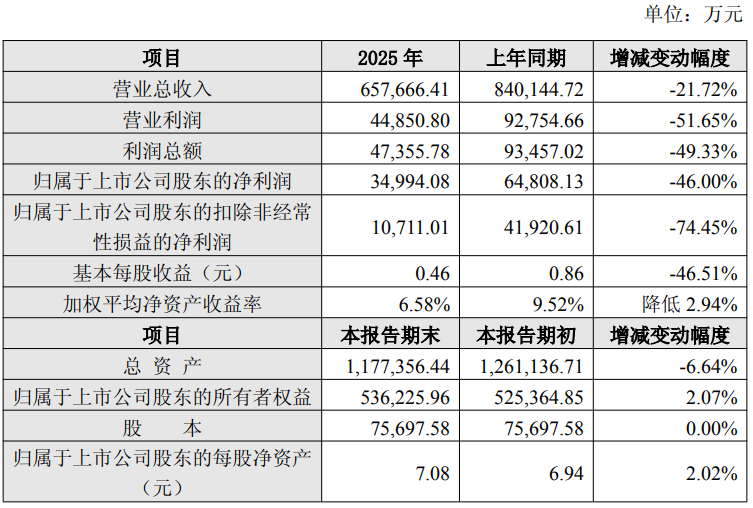 2月6日,昆药集团(600422)发布公告,2025年度业绩快报显示,公司营业总收入为65.77亿元,同比下降21.72%;归母净利润为3.5亿元,同比下降46%。