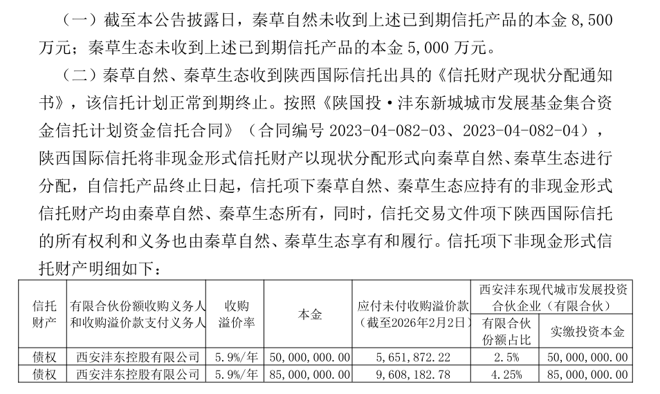 值得注意的是,2025年10月,秦草生态曾顺利完成首笔6300万元本金的赎回,同时获得718万元理财收益,年化回报表现看似可观。但剩余的1.35亿元本金,其中包含秦草自然的8500万元与秦草生态的5000万元,却在产品到期后,遭遇了“现状分配”这一超出预期的结果。