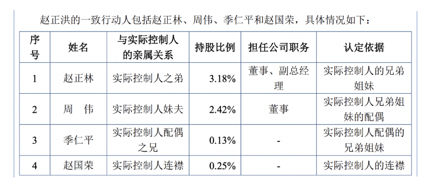 赵正洪的一致行动人包括赵正林、周伟、季仁平和赵国荣,分别持股3.18%、2.42%、0.13%、0.25%。其中,赵正林为赵正洪之弟,周伟为赵正洪妹夫,季仁平为赵正洪配偶之兄,赵国荣为赵正洪连襟。