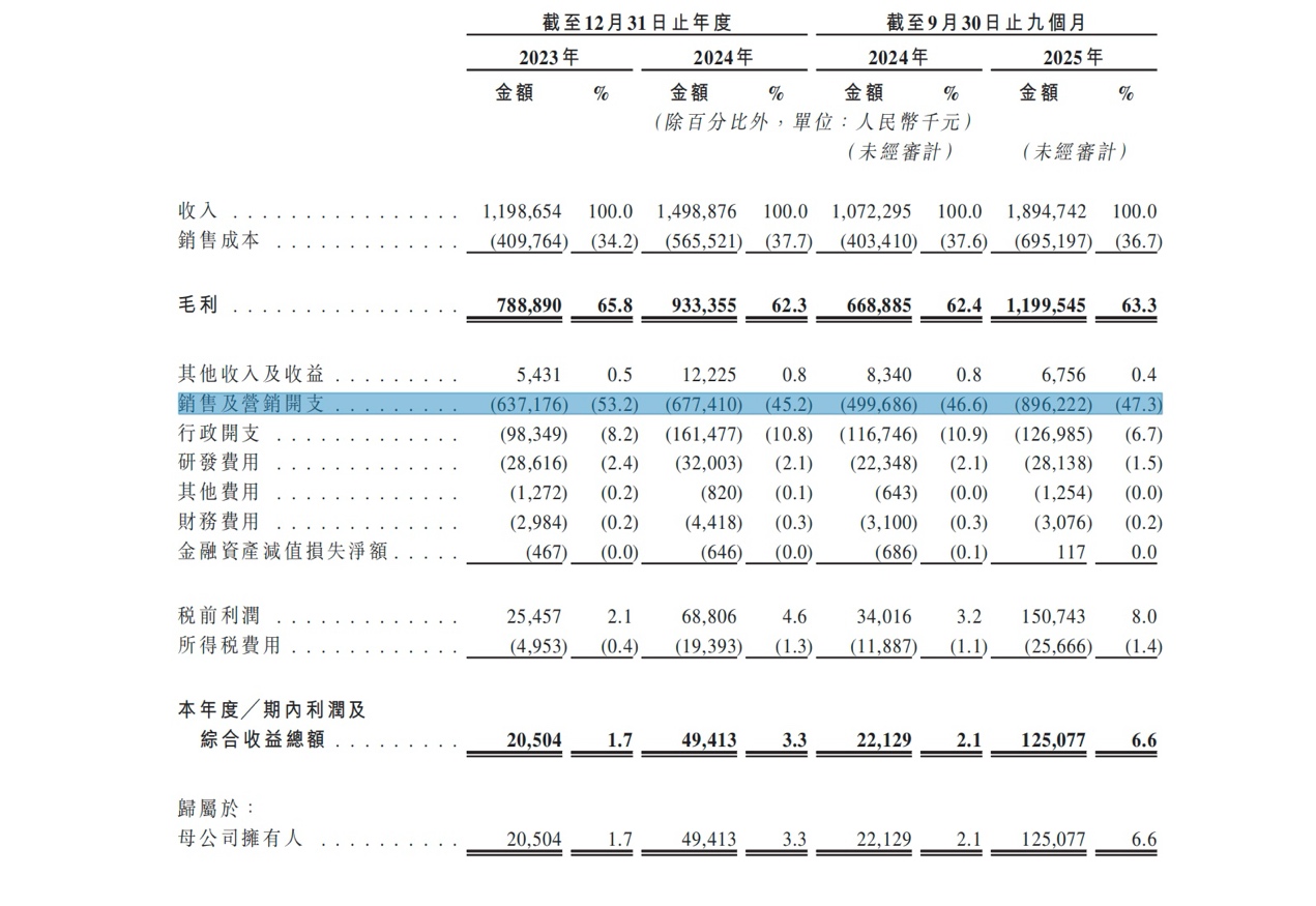 2024年,公司的销售及营销开支为6.8亿元,同比增长6.3%。这一年公司收入同比增长25%。而2025年前三季度,公司透露投入更多市场推广及宣传开支,同比增幅79.3%至9亿元(上年同期5亿元),即前三季度销售费用已经超过2024年全年,比上年同期多花费4亿元,而公司收入只同比增长76.7%,并不如销售费用增幅,净利润更是仅增长了不足1亿元。