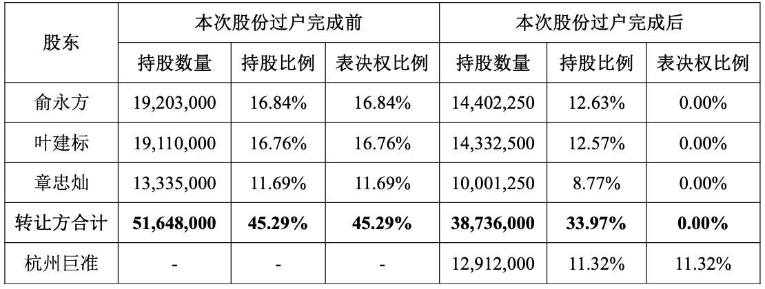 根据公告,控股股东、实际控制人俞永方、叶建标和持股5%以上股东章忠灿三位股东于2026年1月19日与杭州巨准签署《股份转让协议》,合计向杭州巨准转让1291万股股份,占公司总股本的11.32%,转让价格为27.88元/股。转让后,俞永方、叶建标及章忠灿放弃其余3874万股股份的表决权。