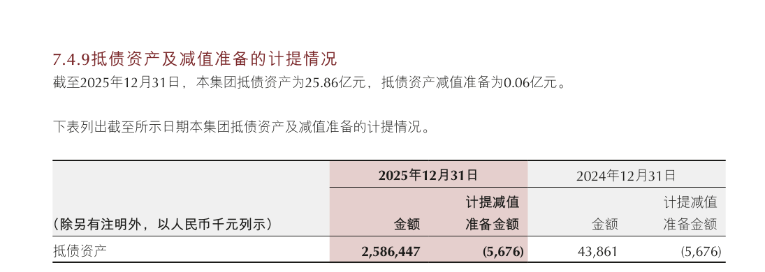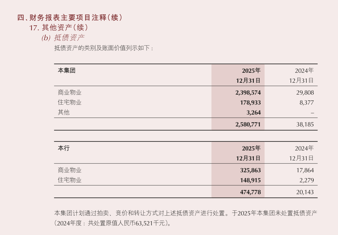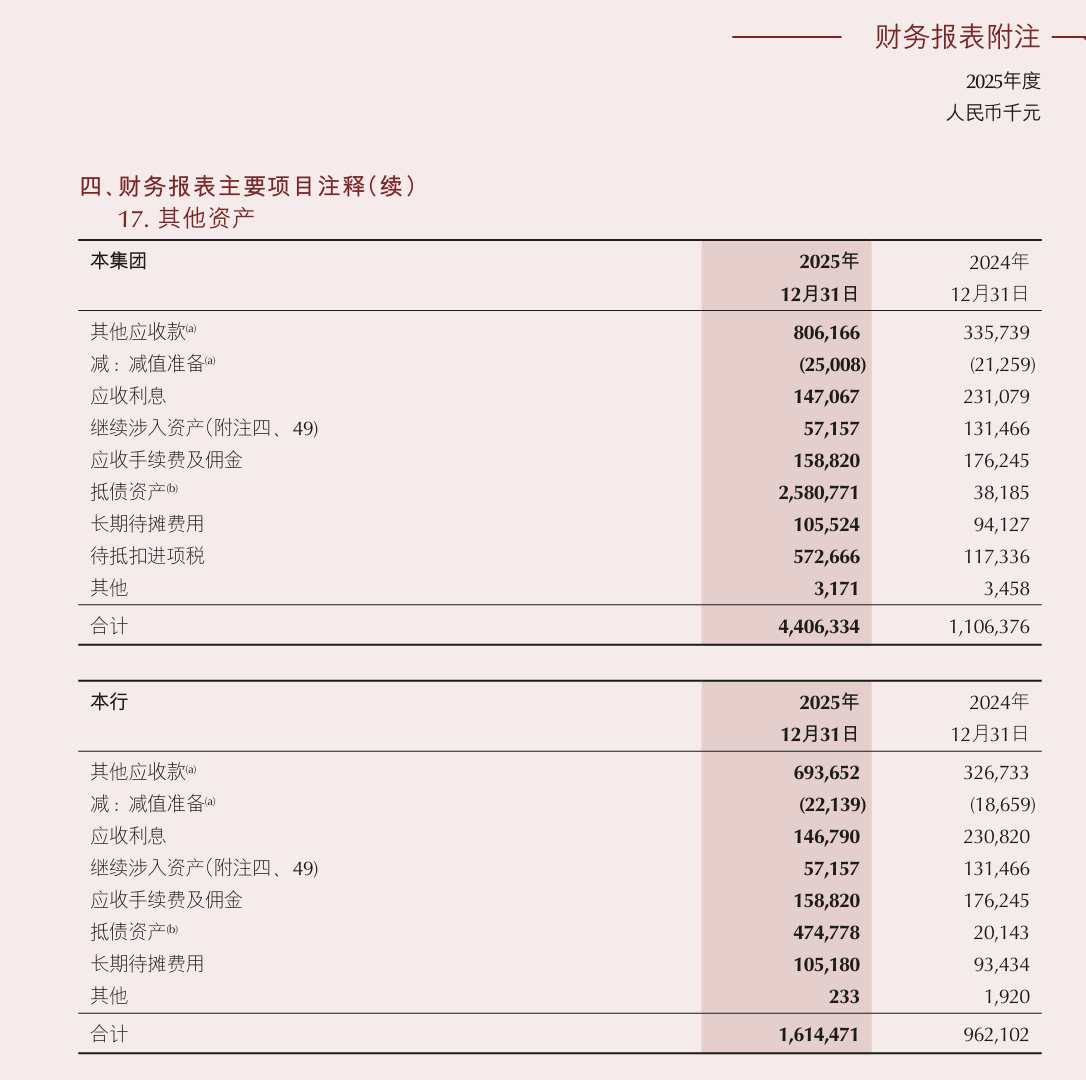 翻阅年报“其他资产”明细可见,截至2025年末,该行集团层面抵债资产账面价值从2024年末的3819万元飙升至25.9亿元,增幅超66倍,体量极为突出,占“其他资产”总额的58.6%,成为该科目下最主要的构成部分。