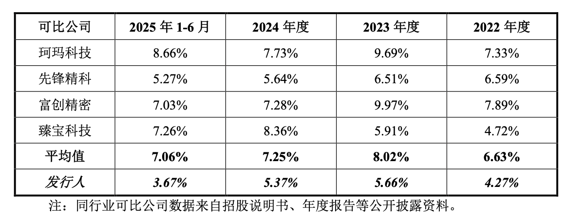 并且,公司的研发费用率也远低于同行,招股书显示,同行可比公司的平均值分别为6.63%、8.02%、7.25%和7.06%,公司与同行的差距甚至呈现出扩大的趋势。