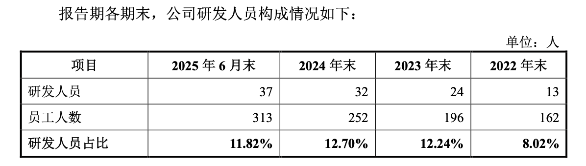 更值得关注的是研发人员配置。截至2025年6月末,公司研发人员数量远少于同行业可比公司,这与其宣称的“技术壁垒”形成反差。在专利储备上,截至2025年6月30日,公司及其子公司已授权专利仅26项,其中发明专利12项,实用新型占据大半。
